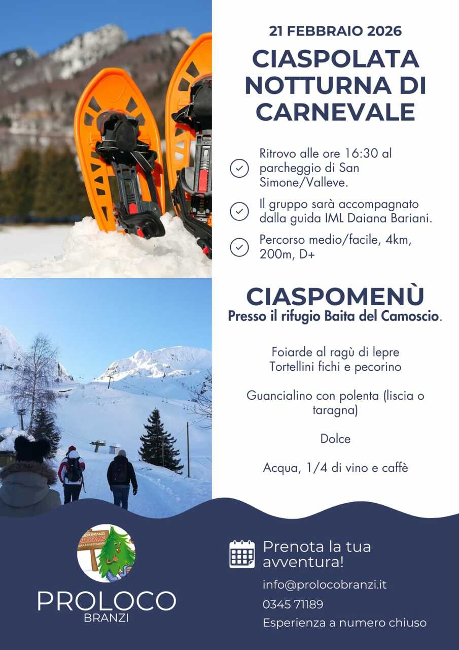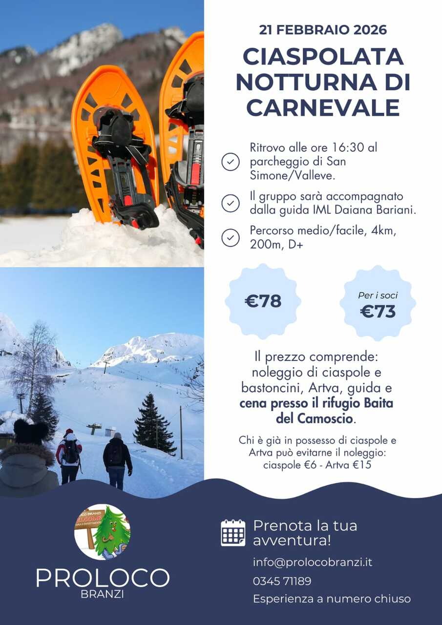 il 21 febbraio 2026 vi aspetta una suggestiva ciaspolata notturna a San Simone – Valleve – nel cuore dell'alta Valle Brembana.