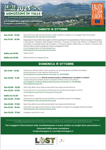 Sabato 14 ottobre la manifestazione prenderà avvio nel pomeriggio con una visita alla Coop. Agricola Sant’Antonio, a cui seguirà una degustazione dei prodotti del progetto LoST EU a cura di un maestro assaggiatore ONAF Bergamo.