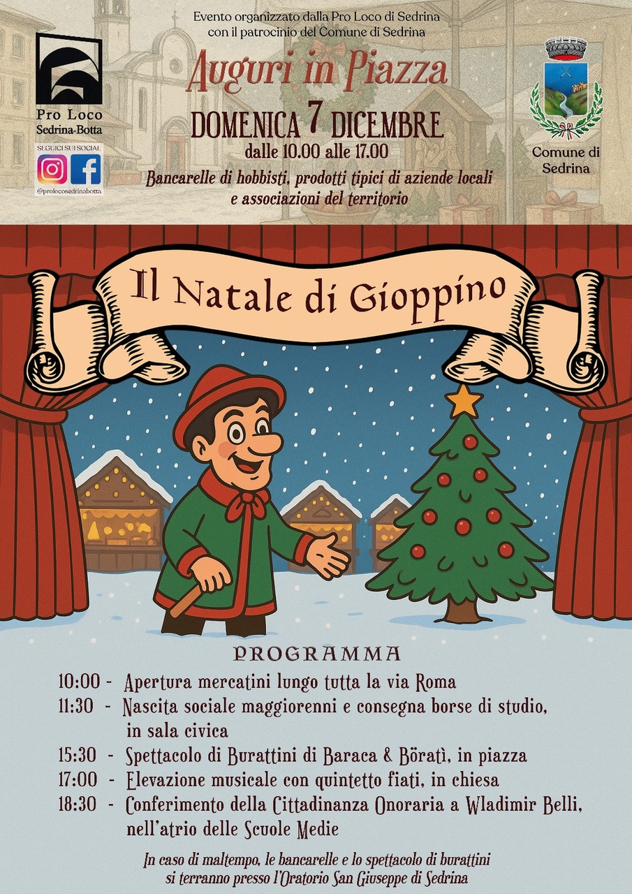 Auguri in PiazzaDomenica 7 dicembre Sedrina si veste a festa con Auguri in Piazza e “Il Natale di Gioppino”: una giornata ricca di atmosfera, tradizione e tanti appuntamenti per grandi e piccoli.