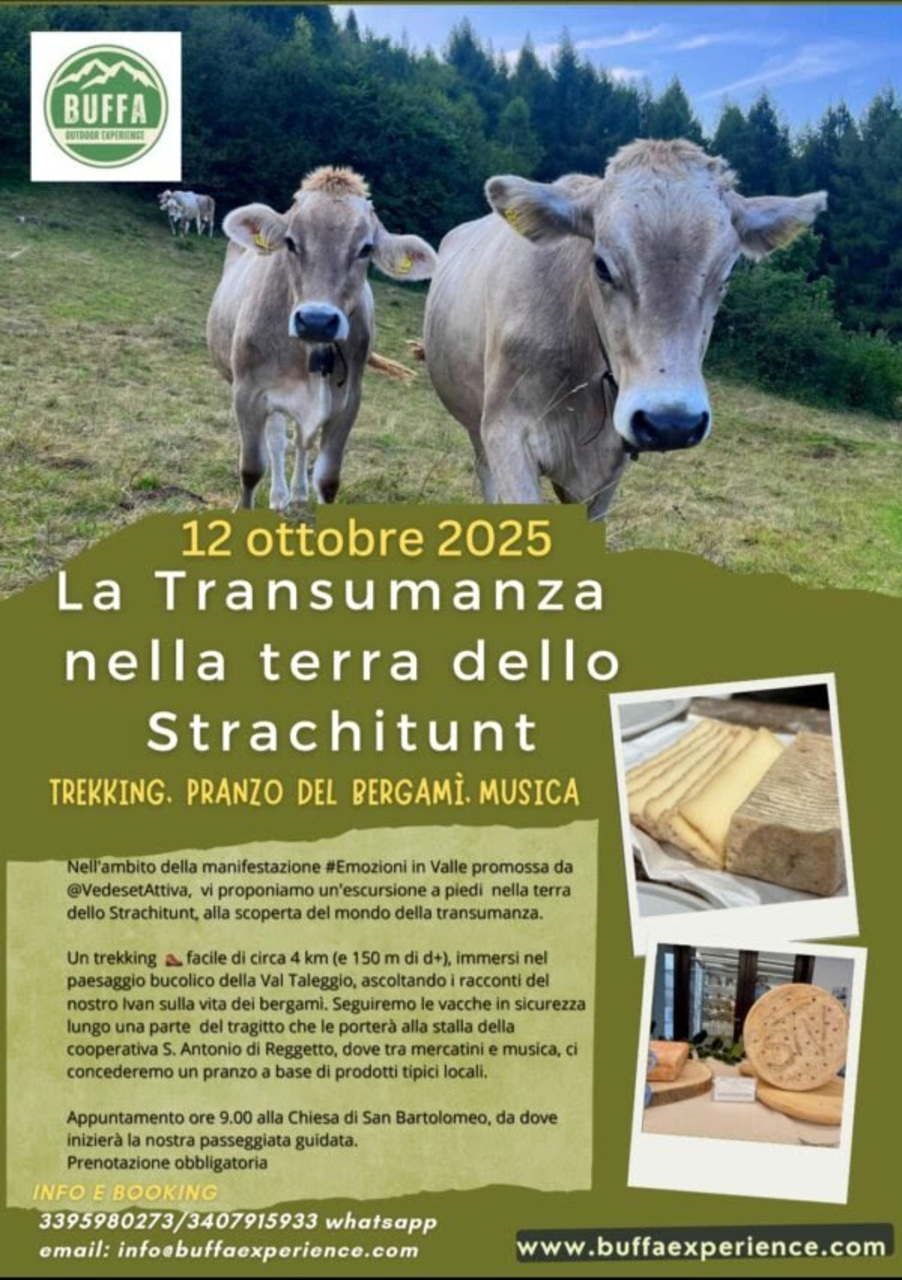 Nell'ambito della manifestazione #Emozioni in Valle promossa da VedesetAttiva, il 12 Ottobre 2025 vi proponiamo un'escursione a piedi nella terra dello Strachitunt, alla scoperta del mondo della transumanza, la tradizionale demonticazione delle vacche dell'alpeggio.