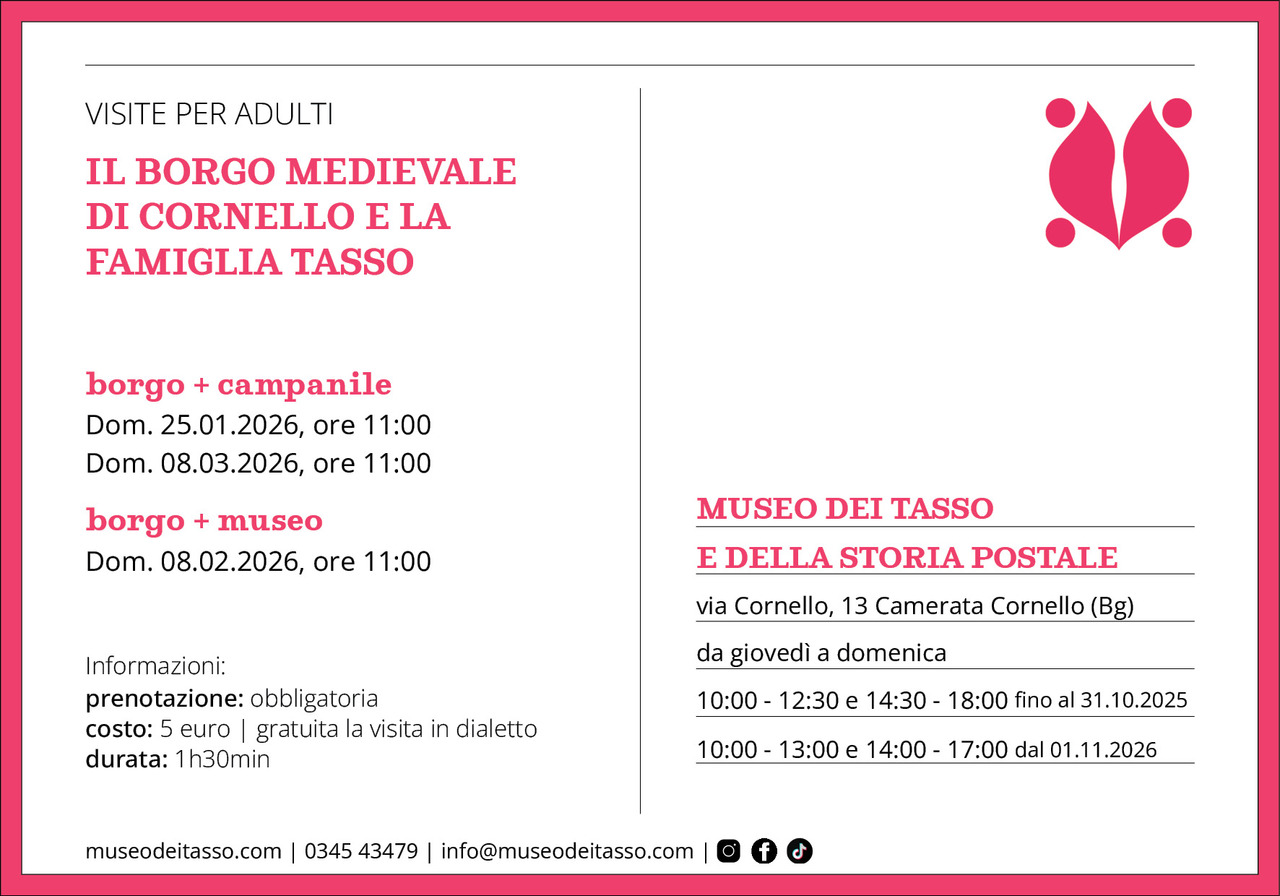 Un’occasione per scoprire il borgo di Cornello dei Tasso (Camerata Cornello, Bg), luogo d’origine della famiglia Tasso, nota in tutto il mondo per l'opera letteraria di Torquato Tasso e per l'abilità imprenditoriale di alcuni suoi esponenti, che fondarono e gestirono per secoli il servizio postale europeo.